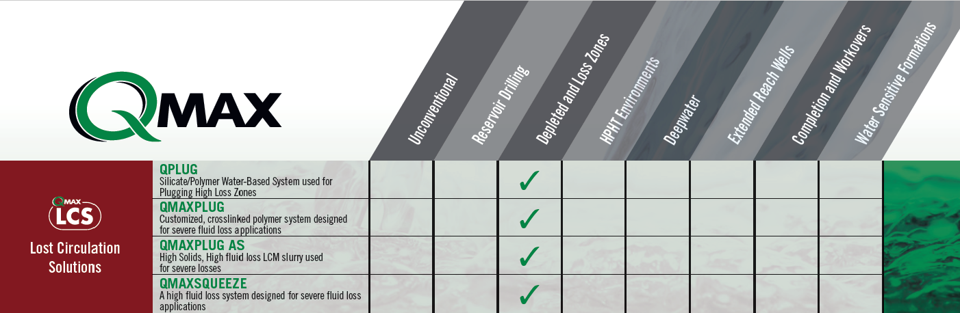 QMAXPLUG is a one-sack blend, heat activated crosslink polymer, that was developed for sealing high permeable and fractured formations when experiencing mud losses.